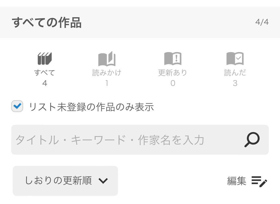 「すべての作品」内で「リスト未登録の作品のみ表示」にチェックを入れると、どのリストにも登録していない作品だけが表示されます。