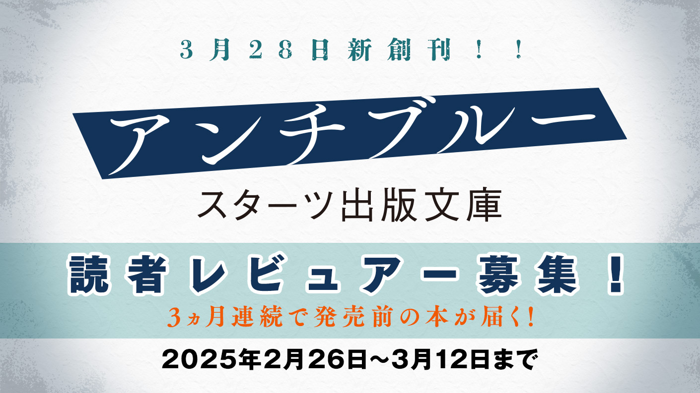 | 概要 | 2025年3月、4月、5月発刊の「スターツ出版文庫アンチブルー」新刊を、3か月連続で発売前にお届けします。各月の新刊をお読みいただき、下記期限までにTikTokやX、YouTubeなどにレビューを投稿してください。 ★レビュー投稿の際には、「スターツ出版文庫アンチブルーのレビュアープログラムに参加しています」と明記してください。 実施期間:2025年3月~2025年5月 レビュー期限:発送月翌月の15日まで