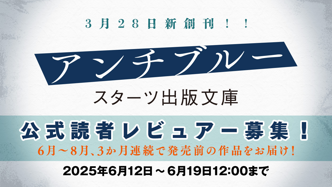 | 概要 | 2025年6月、7月、8月発刊の「スターツ出版文庫アンチブルー」新刊を、3か月連続で発売前にお届けします。各月の新刊をお読みいただき、下記期限までにTikTokやX、YouTubeなどにレビューを投稿してください。 ★レビュー投稿の際には 「スターツ出版文庫アンチブルーのレビュアープログラムに参加しています」と明記してください。 実施期間:2025年6月~2025年8月 レビュー期限:発送月翌月の15日まで