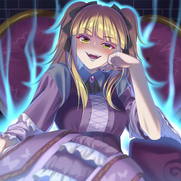 銀髪の長い髪と黒いドレス、褐色の肌。唇と爪は毒々しく紫色で塗られている。