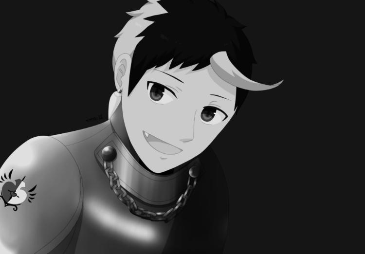 浅葱色と黒色が混じった短髪で前髪の一房だけが長く跳ねており、好奇心に溢れた猫目はサファイアブルー。格好は一目で騎士と分かる、全身銀の鎧で腹部、手、腕と足の一部から、首から手と足の先までをまるごと包み込んでいる黒のインナーが剥き出しだ。右肩には赤い布が垂れ下がり、風に靡いている。