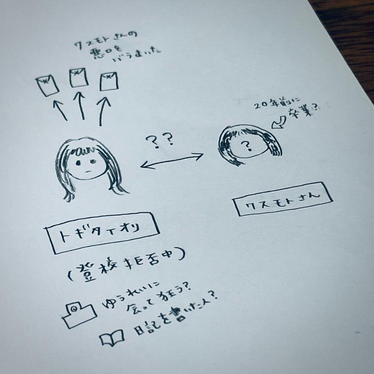 クスモトさんが二十年前に卒業した生徒だとしたら、ふたりには相当な年の差があるはずです。ふたりはどんな関係なのでしょうか。年の離れた友人? 実は親戚? だとしても、トギタイオリがとうの昔に卒業しているクスモトさんのことを学校で言いふらす意味がわかりませんでした。そんなことをしても、今の生徒は誰もクスモトさんのことを知らないのです。