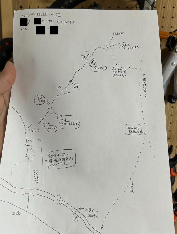 オヒツ谷から降りてきた後にT氏が書いたという遡行図である。