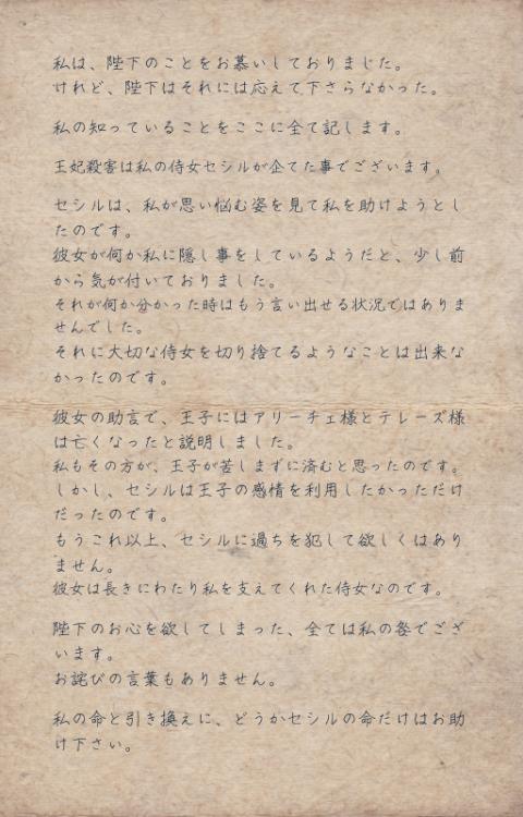 「いいえ、私は王妃様の殺害を企てたりなど…本当に私は無関係です。何も知りませんでした。全てはベルナルダ様が仕組んだこと。ベルナルダ様が犯人です。ベルナルダ様がマルタを唆し、王妃様に青葉花の毒を盛ったのです。」