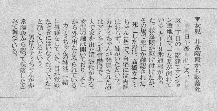 死亡したのは、高橋カナミちゃん(四)で、自宅には両親はおらず、姉がいたという。カナミちゃんが発見されたのはマンション非常階段で、一人で家を出た可能性がある。玄関の鍵は開いており、そこから外へ出たとみられている。