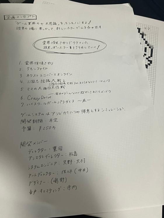 最後に紹介するゲームは『ゲーム業界の七不思議』だ。恐らく読者の中にこのゲームのことを知っている人はほとんどいないだろう。このゲームは世に出ていない。以下が筆者の独自取材で入手したゲーム業界の七不思議の開発資料である。