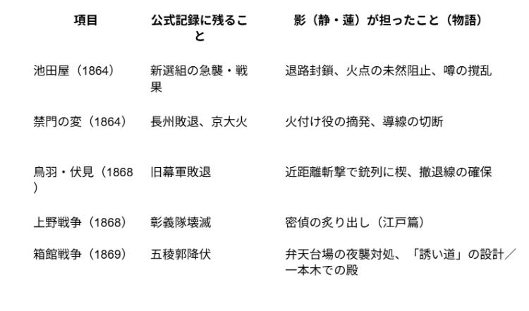 ※年代は原則として新暦(グレゴリオ暦)で併記しています。旧暦で伝わる事件名は一般に知られる呼称を用いました。物語上の人物(沖田静・矢野蓮)は創作ですが、配置や命令系統・戦闘経過は史実に準じています。
