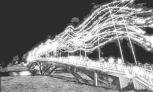 大きな川に差し掛かった車が、電飾球で彩られた光のつり橋を渡る。