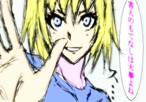 流血雨。空を飛び回る黒髪少女は、戦闘に夢中で後陣には目もくれない。