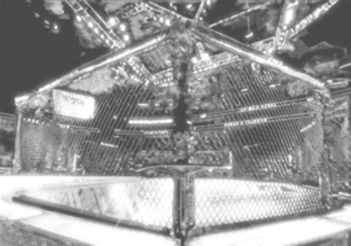 開いた猛獣用の檻から、筋肉質の男が雄叫びを発し猛然と走り込んでくる。