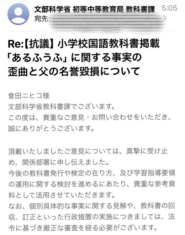 件名:Re:【抗議】小学校国語教科書掲載「あるふうふ」に関する事実の歪曲と父の名誉毀損について