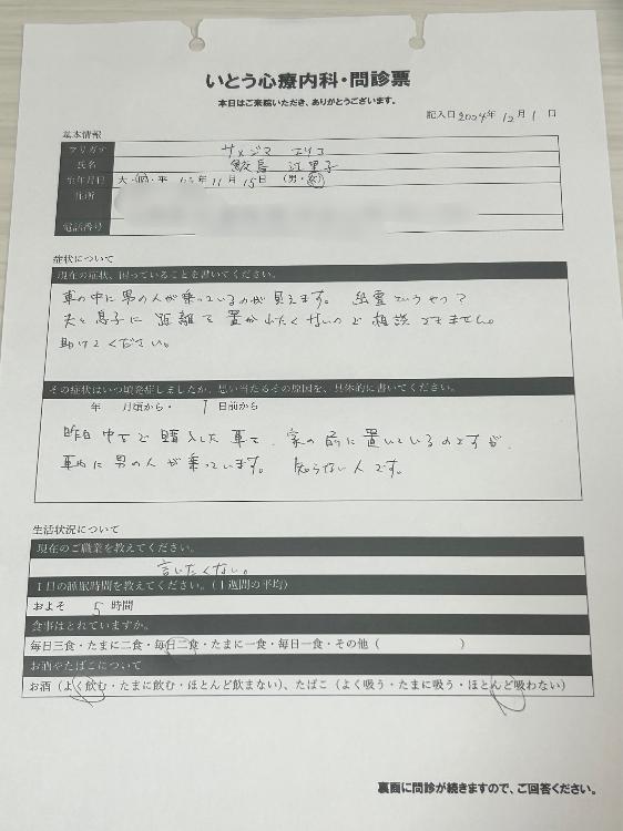 1.主訴(C.C.):幻覚(男性が見える,車両に誰かが乗っているように見える)