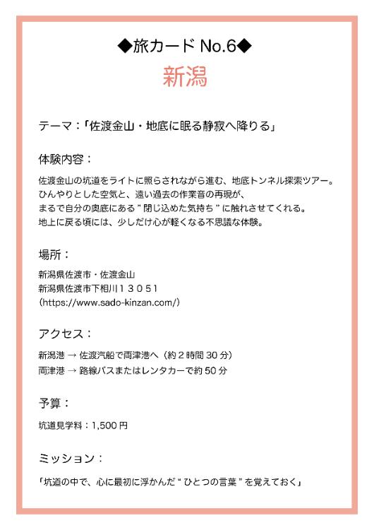 新潟に着いた私たちは、『旅カード』に書かれている通り、佐渡金山に向かうべく船に乗り、海を渡った。佐渡金山では坑道探索をして、はるかなる時の流れに思いを馳せてみた。ずっと昔、この金山を掘っていた人たちがいると思うと、なんだか泣けてきたから不思議だ。