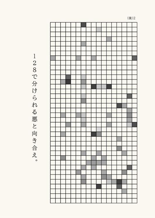 「1番の謎のように、最初に投稿されたベースの画像から文字を拾ってきて並べ替える謎だとするなら、『悪と向き合え。』が『黒マスを読め』を意味していると推理できます。ただ、マス格子には黒マスというより、濃淡様々な灰色のマスが配置されています。いったいどれを読むのかがわかりません」