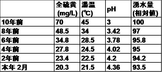「そうです。ここからが本題ですが、定期成分分析の結果を比較すると、この10年で全硫黄量は70㎎/㎏から20㎎/㎏へ急落、同時に㏗は3から4.36へと中性化が進んでいます。湯温も45度から21.5度へと低下し、湯色も薄くなりました。詳しい数値はこのシートに整理したんですけど…」