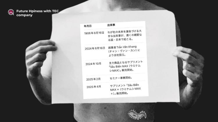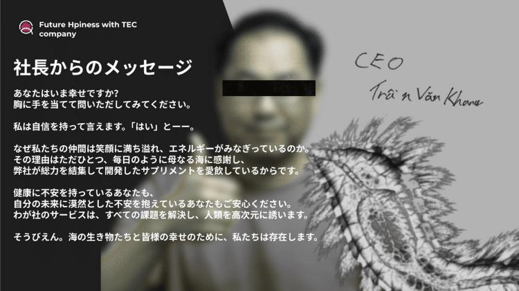 「私の偉大なる曾祖父は、日本の離島へ留学をしていました。日本とは大きなご縁を感じています。私が手にした魔法の言葉と、科学の粋をあつめてつくり出したサプリメントを日本に届ける計画は、間もなく始動しようとしています。楽しみにお待ちください」