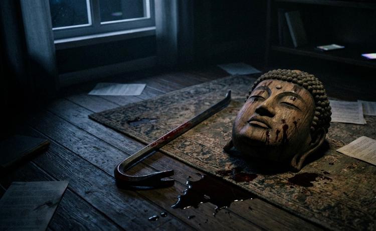 遺体の影には、血のついたバールと仏像が映り込んでいた。