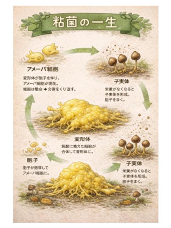 誰かが「死んじゃうの?」と聞いた。学芸員は少しだけ目を細めて微笑んだ。 「いい え。死ぬのではなく、眠るんです。胞子はとても硬い殻に守られていて、何十年経っても 死にません。どんなに乾燥しても、強い薬をかけられても、ただじっと『次のチャンス』 を待つんです。そして雨が降り、湿度が戻り、周りに『柔らかいエサ』が現れたその瞬間 に…」 彼女は指をぱっと広げた。 「胞子は一斉に目覚め、またアメーバーのように溶け 合い、ひとつの巨大な『変形体』となって動き出すんです」