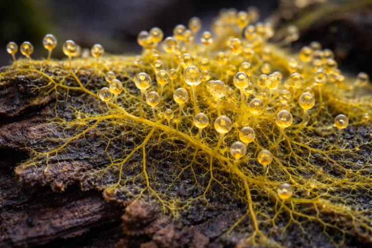 展示室は外の天気に比べて明るく、乾いていた。壁には写真と図解、中央のケースには 小さな乾燥標本が並んでいる。 変形菌。あるいは、粘菌。 「名前に“菌”ってついていま すけど、ばい菌ではありませんよ。キノコの仲間でもありません。植物でも、動物でもないんです。」 子どもたちは首を傾げる。学芸員は笑って続けた。 「でも、生きています。 しかも、動くんですよ。それも、お腹を空かせた動物のように」