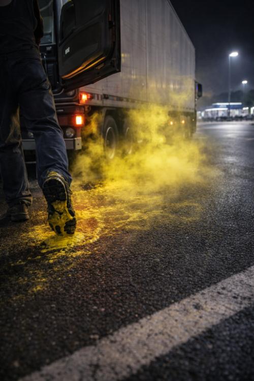 [深夜便トラック運転手・手記(7 月 5 日未明)] 「東名高速を下っている最中だった。深 夜のしじまのなか、荷台の隙間から、まるで生き物が呼吸しているような、茶色い霧が漏れ出しているのが見えた。でも、同時に猛烈な寒気がした。風もないのに、その霧は道路 の路肩に沿って、這うように流れていく。まるで、行き先を知っているみたいに。 サービスエリアで車を止めたとき、靴の裏に、べっとりと黄色い『何か』が付いていた。拭って も、拭っても、それは吸盤のように靴底にしがみついて離れない。