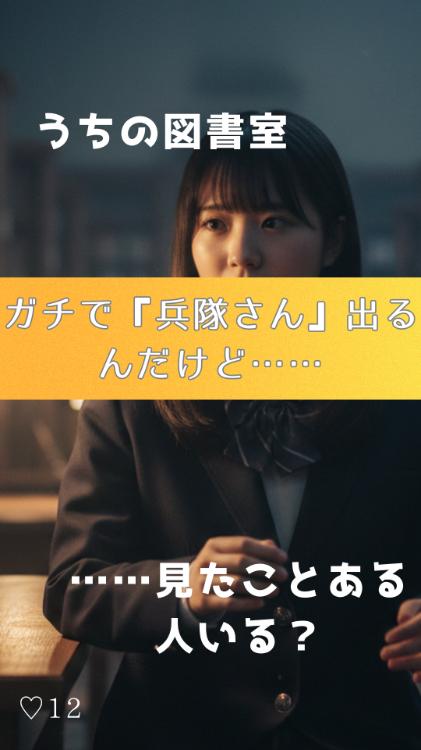 テロップ: 「うちの図書室、ガチで『兵隊さん』出るんだけど……見たことある人いる?」