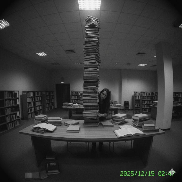 【写真2】閲覧机に「本の塔」を作る様子を捉えた別の映像。一見して不穏な空気感を漂わせているが、グリッチ(画像の乱れ)が特定のパターンを繰り返しており、意図的な加工の疑いが濃厚だ。影の落ち方や、本の背表紙の文字が読めない点などから、AIによるフェイク画像の特徴と一致する。