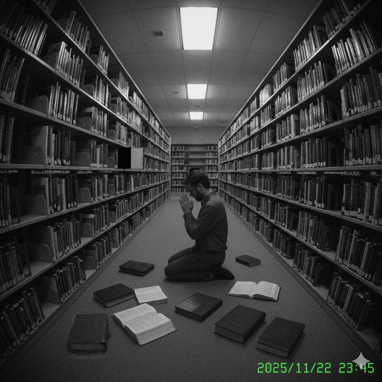【写真1】SNSで拡散された、深夜の図書館内で奇行に及ぶ人物を捉えたとされる画像。低解像度ながら、専門家は「背景の書架と人物の境界線が不自然に融けており、AI生成特有の不整合が見られる」と分析する。