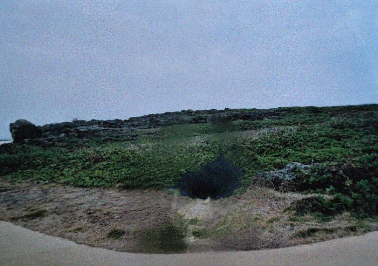 ・その曇り空と、草に覆われている隆起した岩壁の写真画像が、いつどこで撮影されたかは不明。
