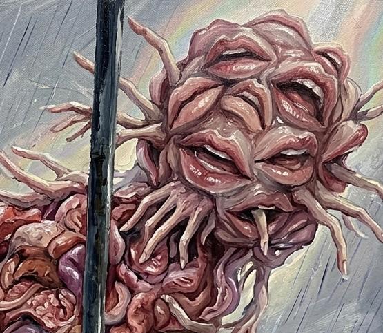 「あいつは、空に不気味に浮いてるんだ。自分の腹を裂いて、剥き出しになった内臓を手でもてあそんでる。まるで、高いところから飛び降りて、地面に激突して破裂した死体そのものみたいな見た目でな……」