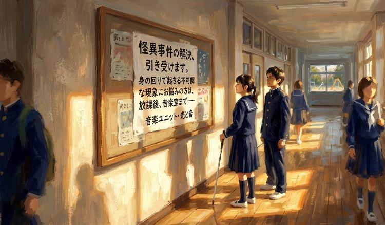 『怪異事件の解決、引き受けます。身の回りで起きる不可解な現象にお悩みの方は、放課後、音楽室まで――音楽ユニット・光と音』