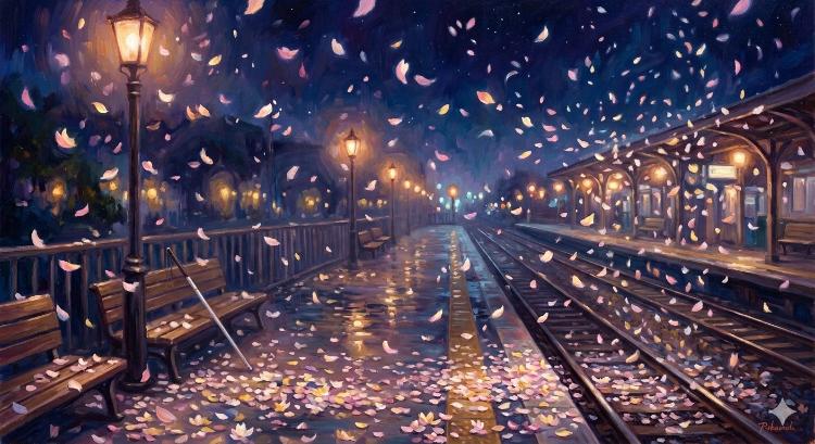 僕らはしばらくの間、睡蓮の花びらが舞うホームの隅で、無言のまま立ち尽くしていた。夜の駅を支配していた巨大な音の巣窟は、いつのまにか、潮が引くように静まり返っている。