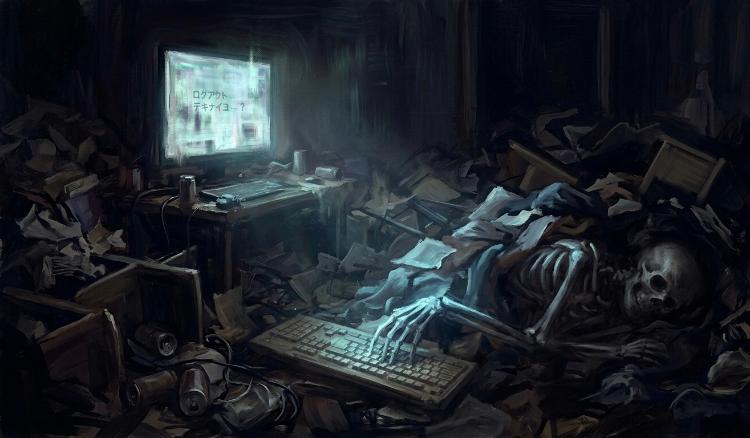 耳を澄ませば、部屋の隅――おそらくPCモニターの青白い光に照らされた場所から、骨と皮だけになった遺体が放つ、乾いたクリック音が今も響き続けている。