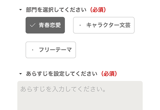 - 「1話からの長編大賞」に応募する作品は、「第2回1話だけ大賞」で応募した際に選んだ部門で参加する必要があります。