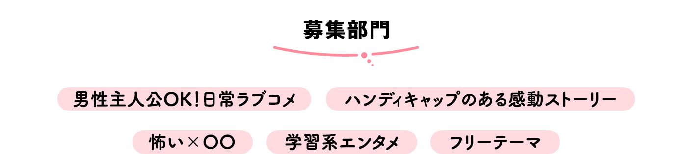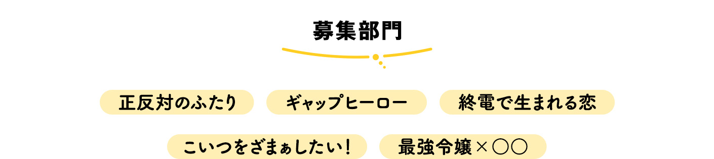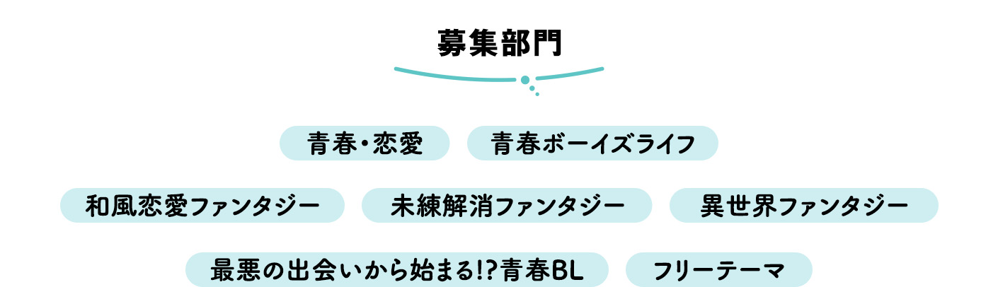 男子二人の絆を描いた青春ボーイズライフを募集します。平凡な日常、退屈な毎日を送る主人公が、自分とは正反対な誰かと出会い、世界が彩られていく物語。そしてただずっと楽しいだけではなく、二人の関係性を妨げる非日常的な要素があり、だからこそ、恋愛ではなく二人の絆の強さが感じられる作品を歓迎します。楽しくて、でも感動、そして涙できるようなエンタメ色の強い青春ボーイズライフ作品をお待ちしています。
