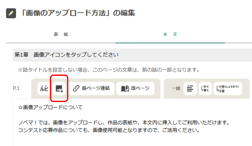 | 画像アップロードについて | ノベマ!では、画像をアップロードし、作品の表紙や、本文内に挿入してご利用いただけます。コンテスト応募作品についても、画像使用可能となりますので、ご活用ください。 ◆画像のアップロード方法