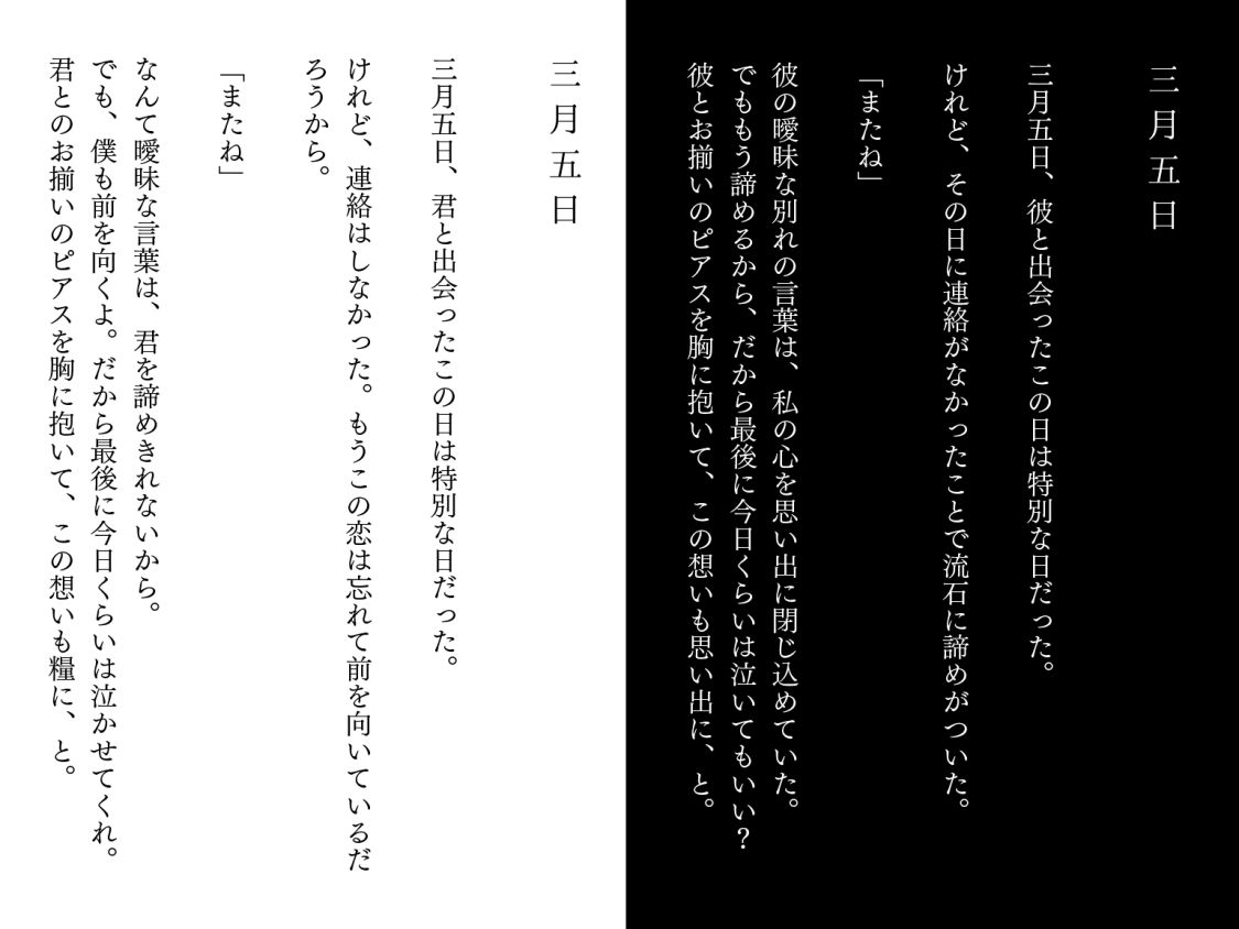 - 同じセリフ・場面であっても男女で考えていることが違うなど、2視点ものならではのすれ違いを描いてください。